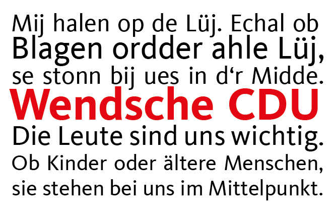 Die CDU ist seit jeher die stärkste politische Kraft in der Gemeinde Wenden. Durch unsere Entscheidungen im Rat, in den einzelnen Ortsunionen und in der Gemeindeunion haben wir zur positiven Entwicklung unserer Heimat maßgeblich beigetragen. Dies möchten wir weiterhin fortsetzen. Helfen Sie uns dabei.